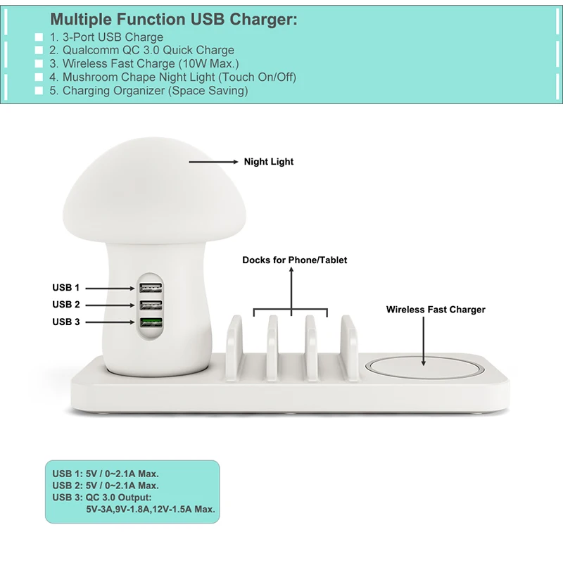 Product Name: Leebote chargeur de téléphone USB Multiple lampe de nuit champignon Station de charge sans fil Dock QC 3.0 chargeur rapide pour téléphones mobiles