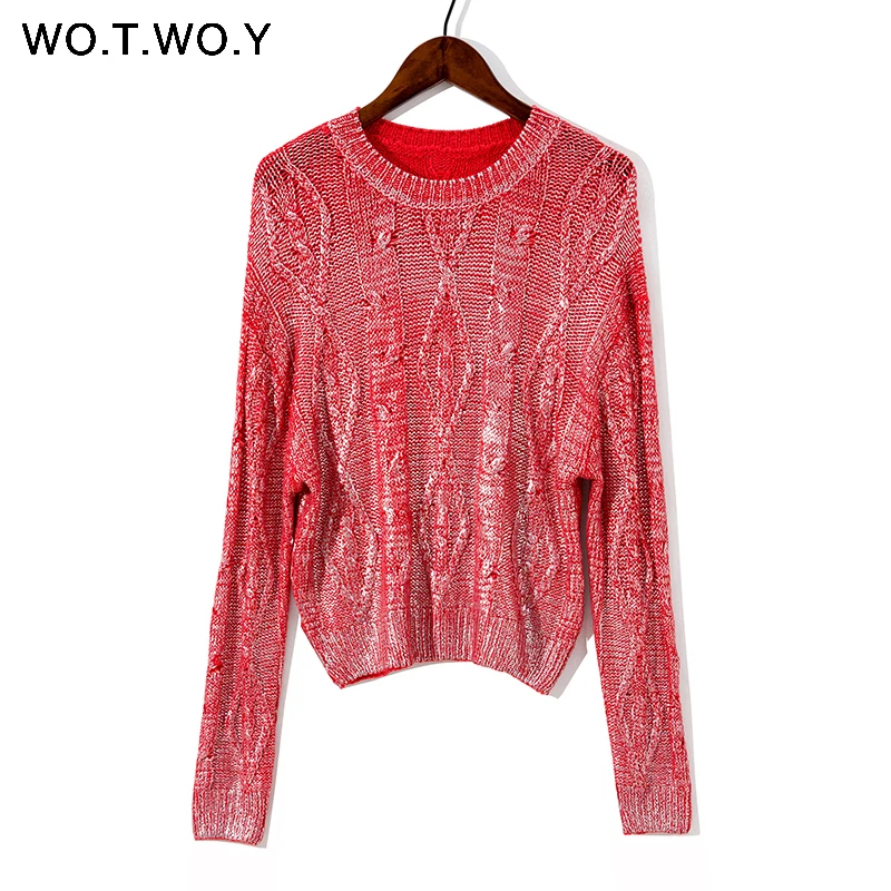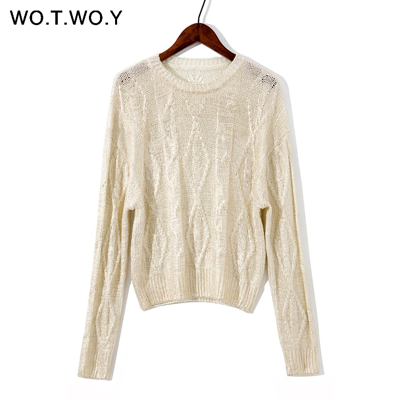 Product Name: WOTWOY 2019 automne hiver brillant or timbre croisé tricoté femmes chandails décontracté doux col rond à manches longues pull femmes
