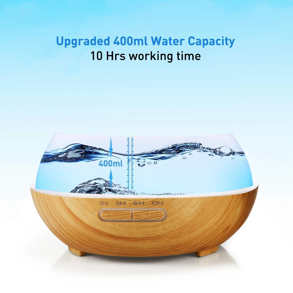 Product Name: KBAYBO humidificateur d air à ultrasons 400ml arôme diffuseur d huile essentielle avec Grain de bois 7 LED à couleur changeante lumières pour bureau à la maison