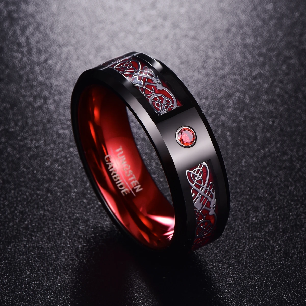 Product Name: 2018 nouveauté argent Dragon motif rouge Zircon hommes anneaux 100% carbure de tungstène bandes de mariage Anillos Para Hombres anneau