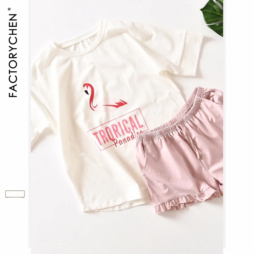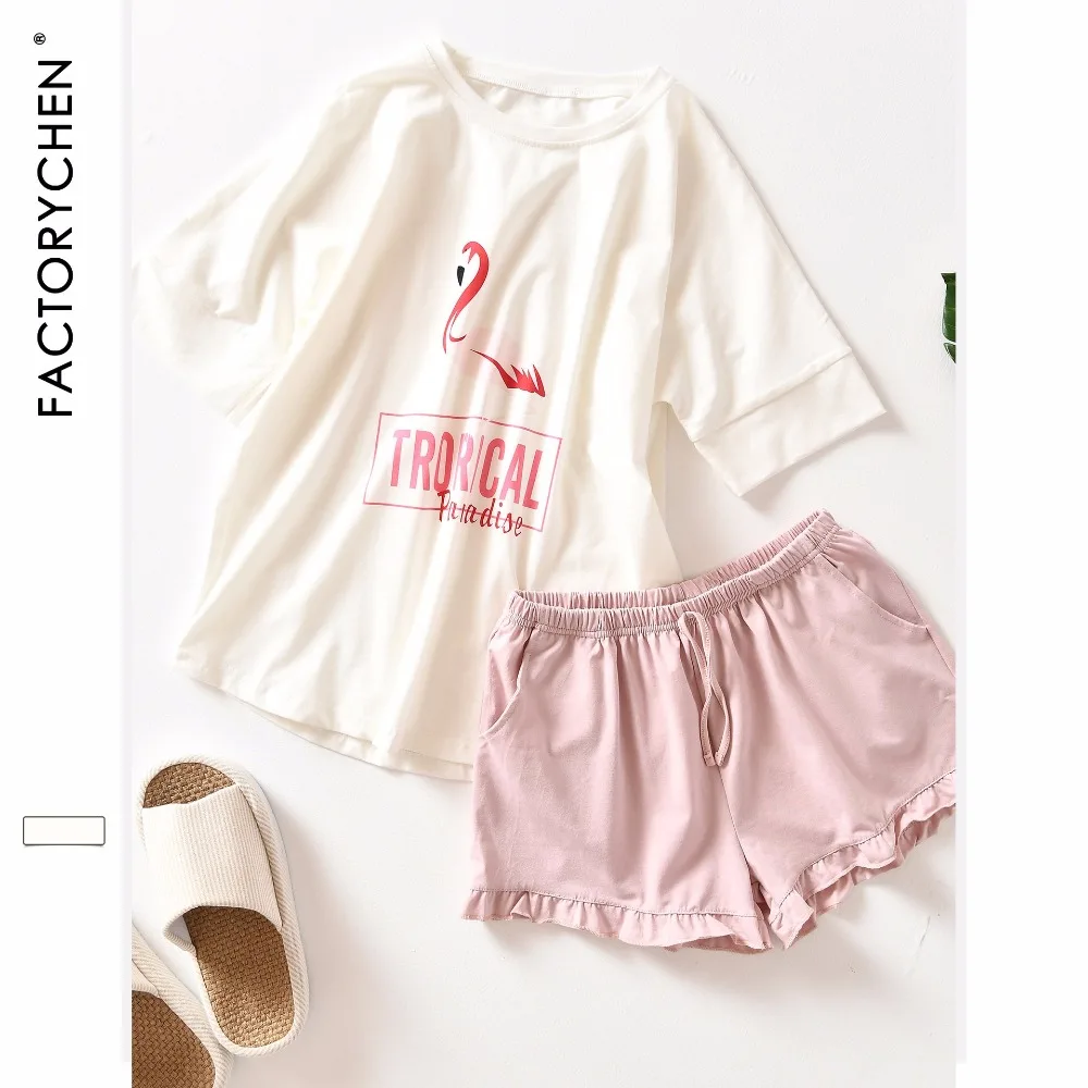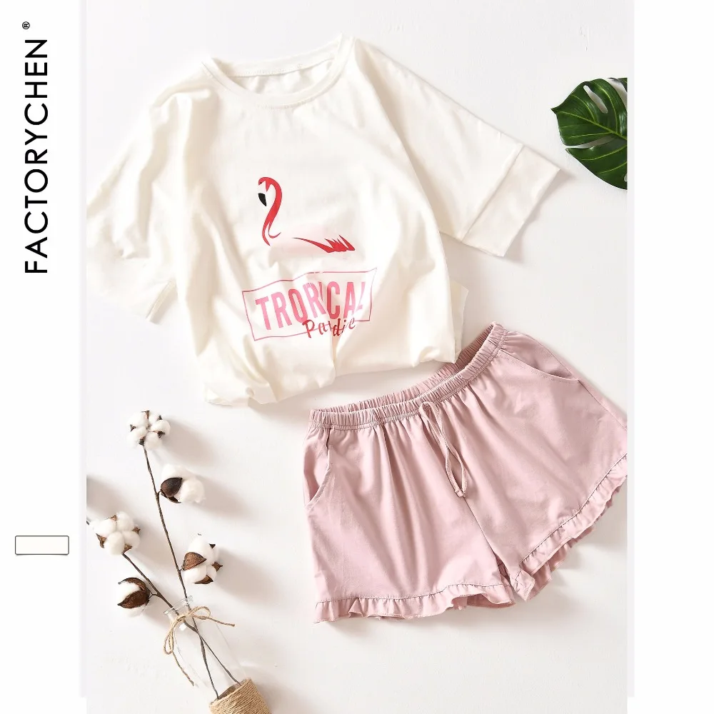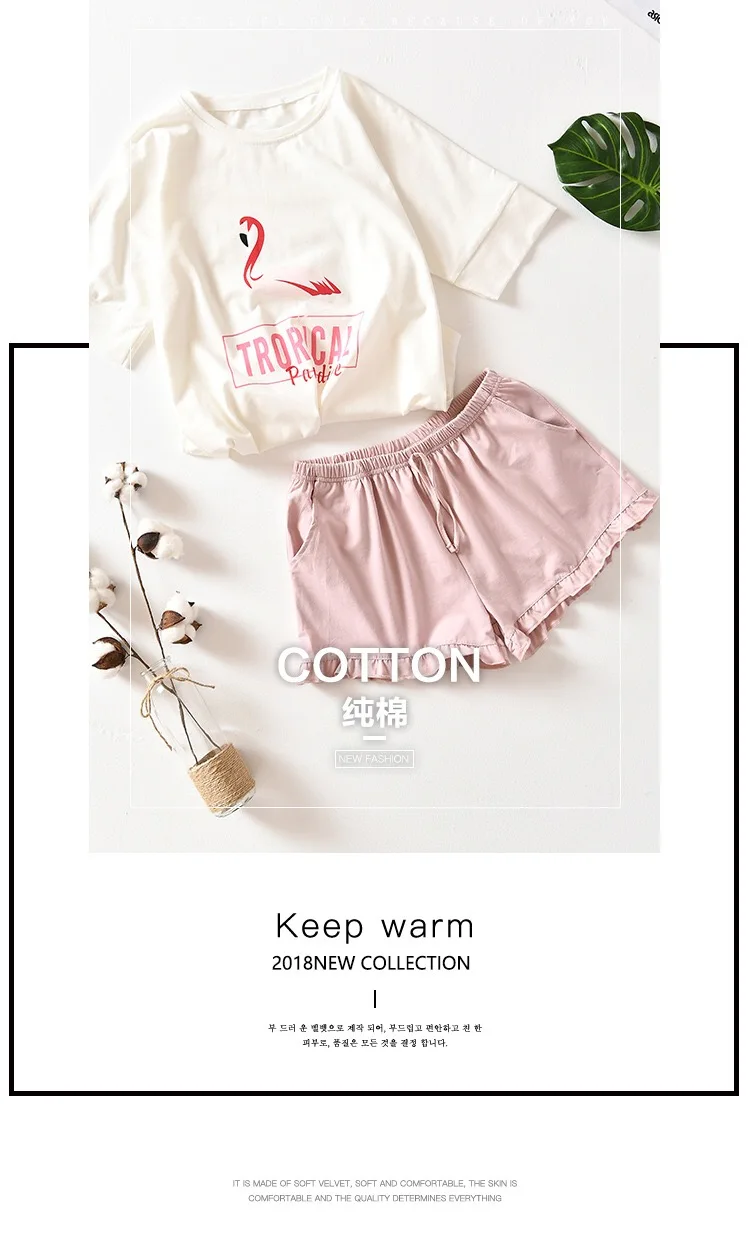 Product Name: Flamants roses manches courtes + Shorts maison costume Spot 100% coton pyjama ensembles été nuit recommandé femmes pijama maison vêtements