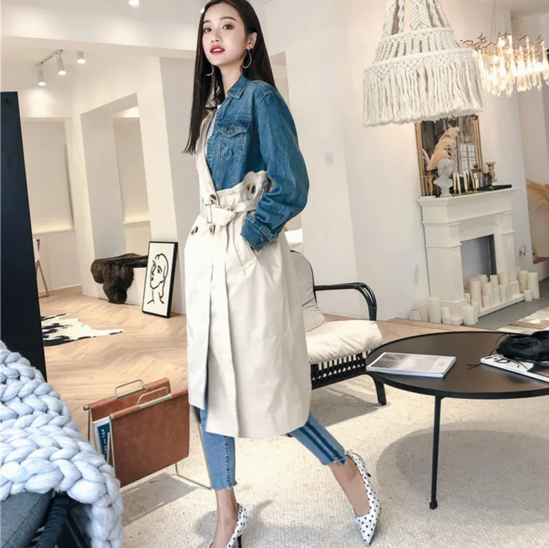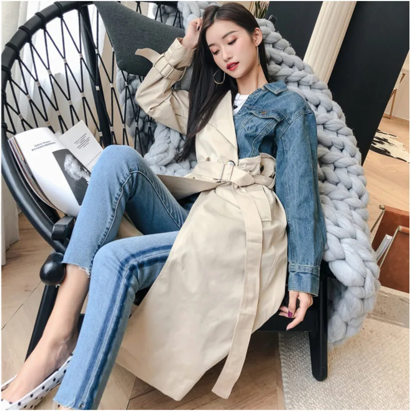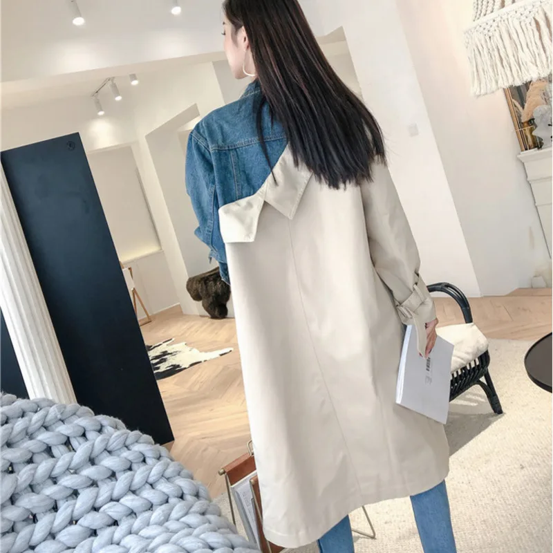 Product Name: LANMREM 2019 nouvelle mode printemps Double boutonnage Patchwork Denim col rabattu manches décontracté femmes coupe vent YE53712