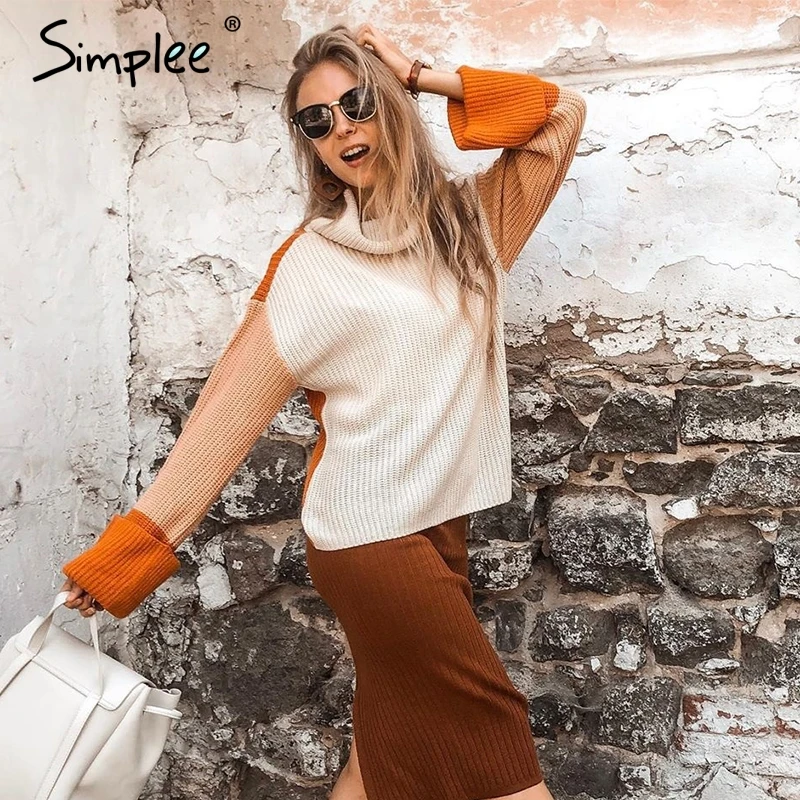 Special Offer Simplee Patchwork col roulé tricoté chandails femme décontracté à manches longues coréen pull pull femmes streetwear dames pull Discount 40% Today!