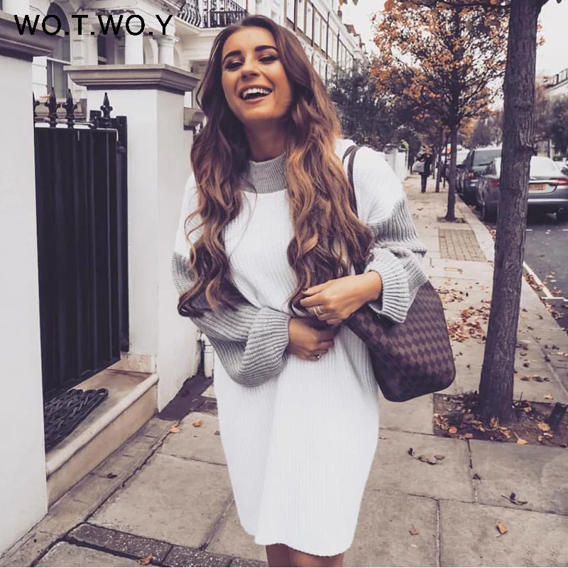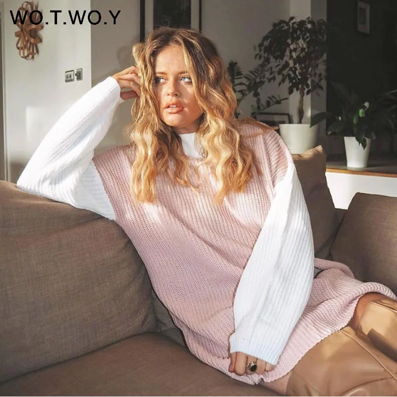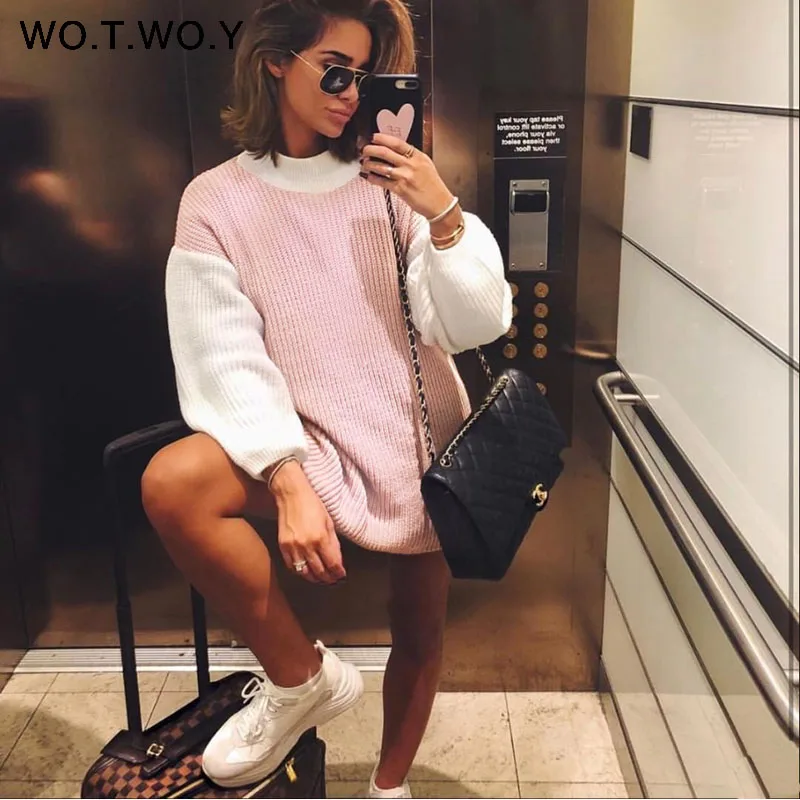 Special Offer WOTWOY col roulé Patchwork chandails femmes lanterne manches couleur bloc pull kaki rose pull femmes 2019 automne haut d hiver Discount 47% Today!