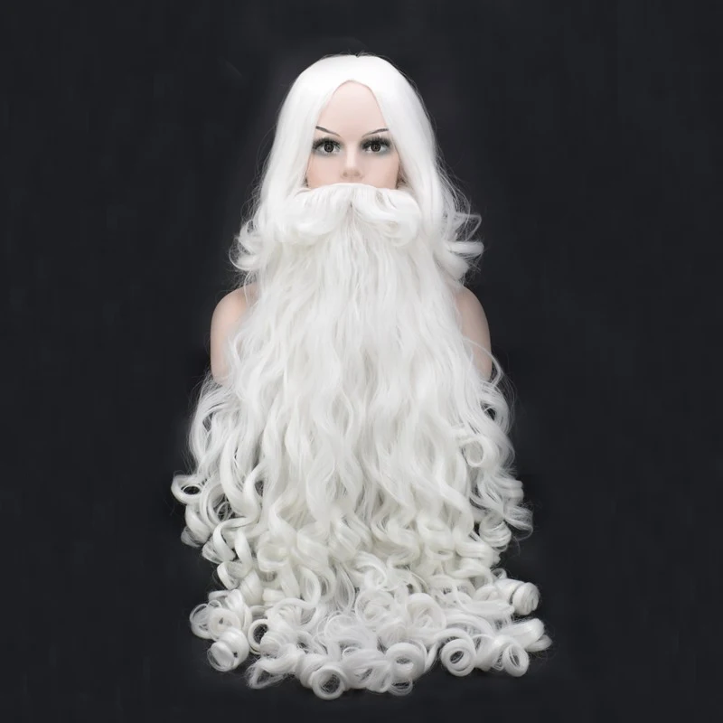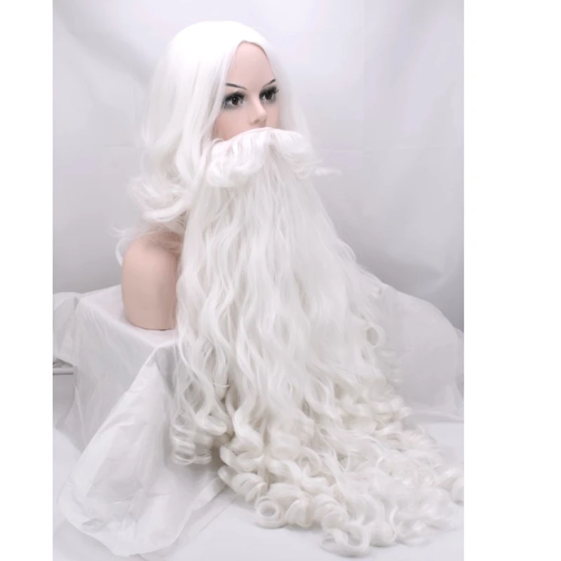 Product Name: JOY   BEAUTY Santa Claus longue perruque ondulée blanc Santa Claus barbe ensemble fantaisie haute température Fiber Cosplay perruque