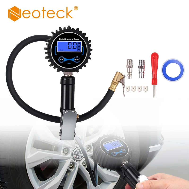 Special Offer Neoteck gonfleur de pneu numérique 0 200PSI avec manomètre avec 4 bouchons de Valve US EU jauge de gonflage de pneu en acier avec tuyau en caoutchouc Discount 49% Today!