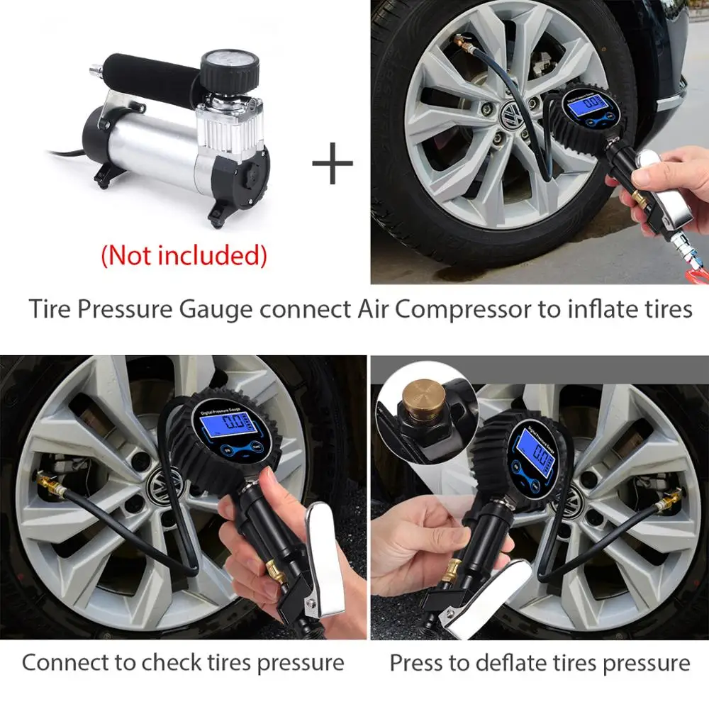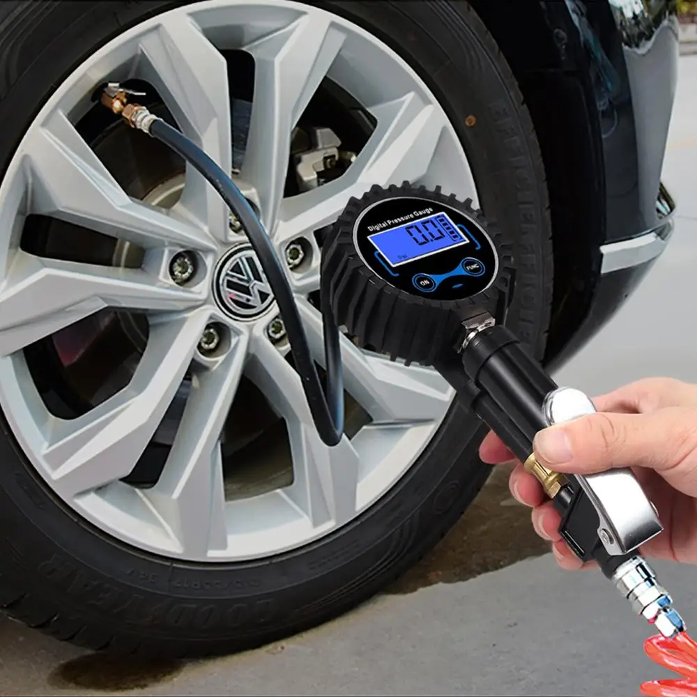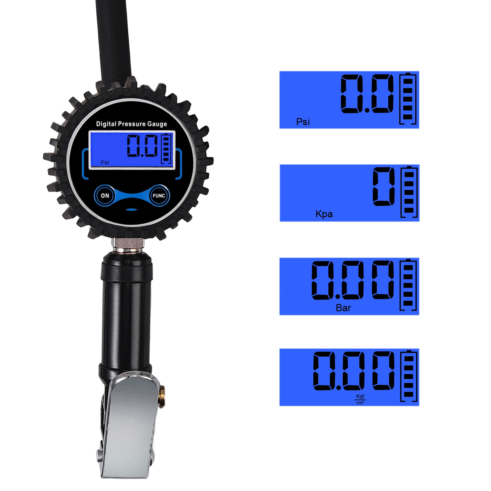 Product Name: Neoteck gonfleur de pneu numérique 0 200PSI avec manomètre avec 4 bouchons de Valve US EU jauge de gonflage de pneu en acier avec tuyau en caoutchouc